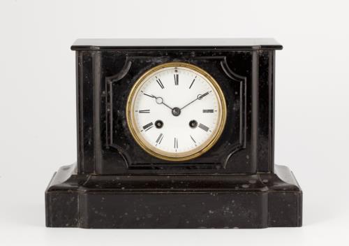 1 pendule "borne" époque Napoléon III en marbre noir. Mvmt Japy Frères. Fonctionne. Manque balancier. H 19.8x28x13.5cm