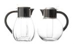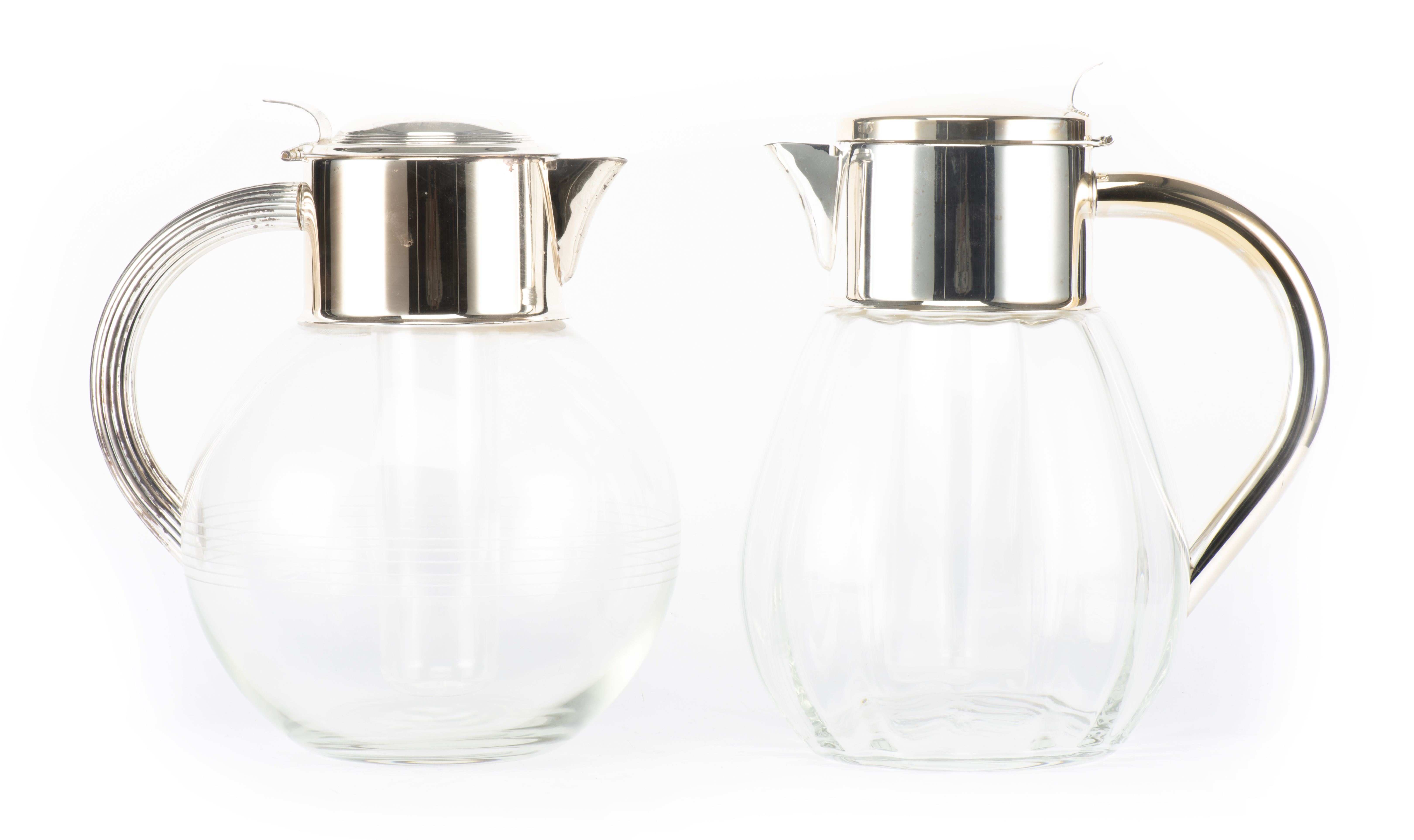 On y joint une paire de carafes à système en verre, metal argenté et chromé l'une ovale à anse lisse et l'autre ronde à anse cannelée.