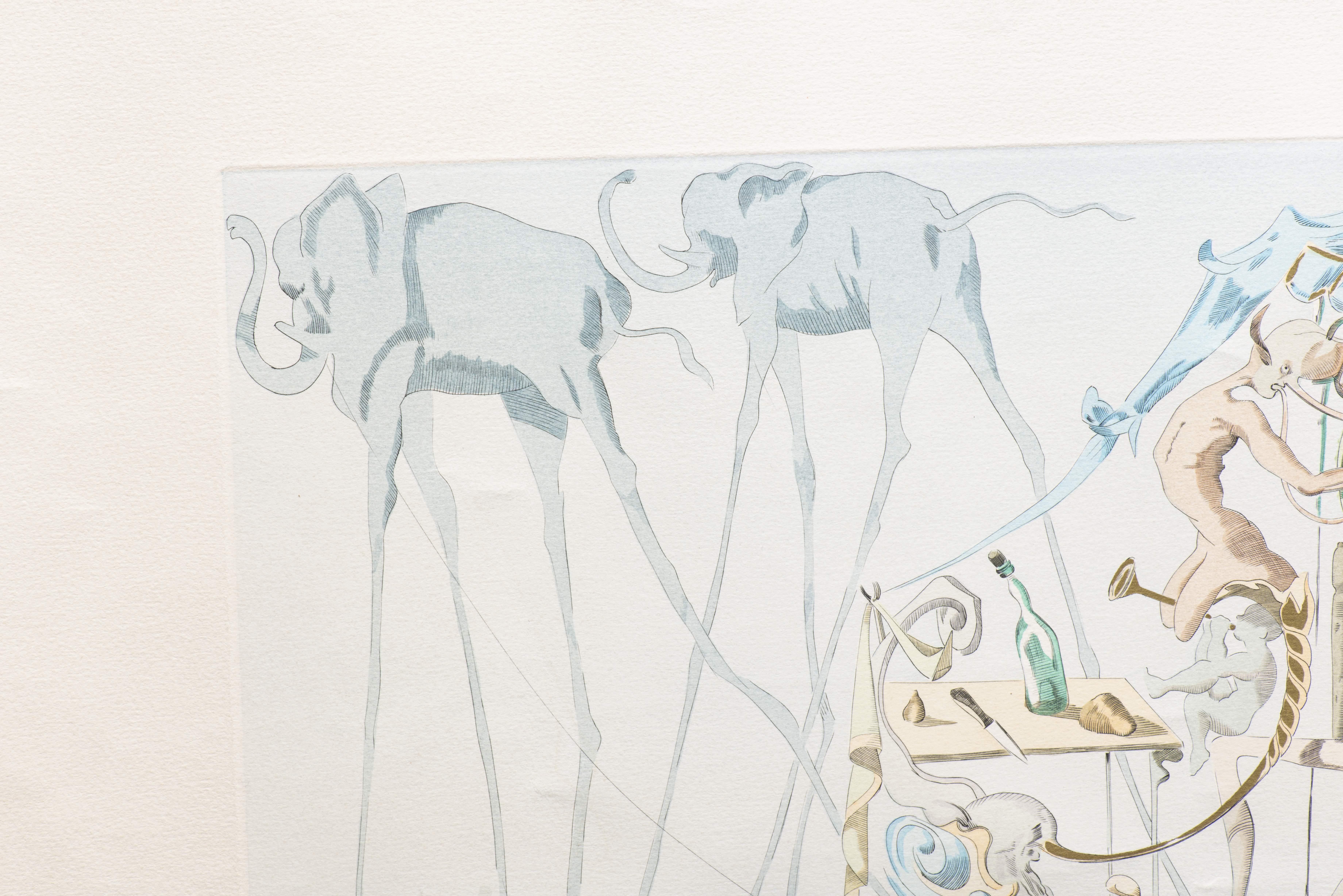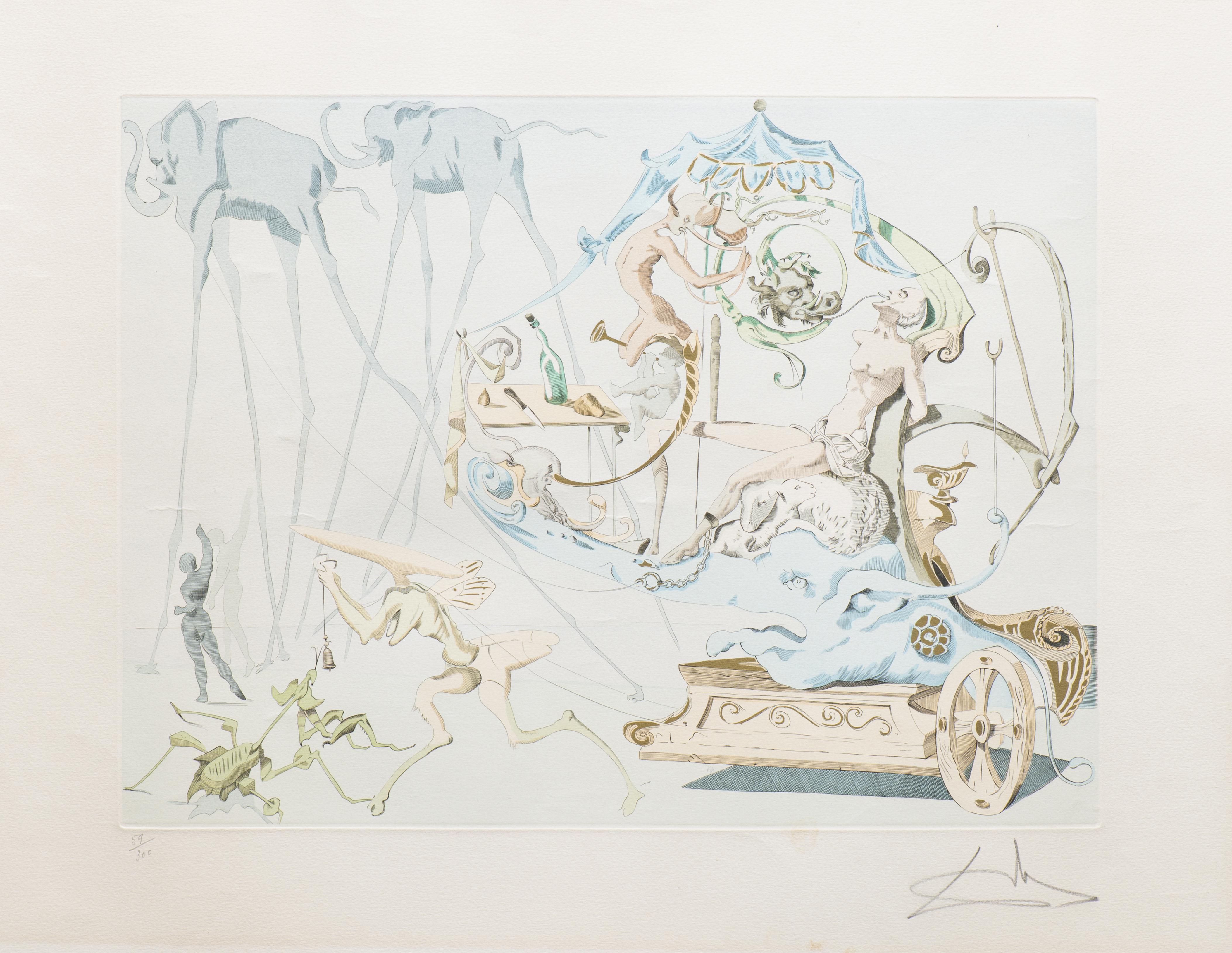 Salvador DALI (1904-1989), "Dionysos", 1967, lithographie en couleurs sur papier Arches Paris représentant Dionysos sur son char, numéroté 59/300 au crayon en bas à gauche et signé au crayon en bas à droite.