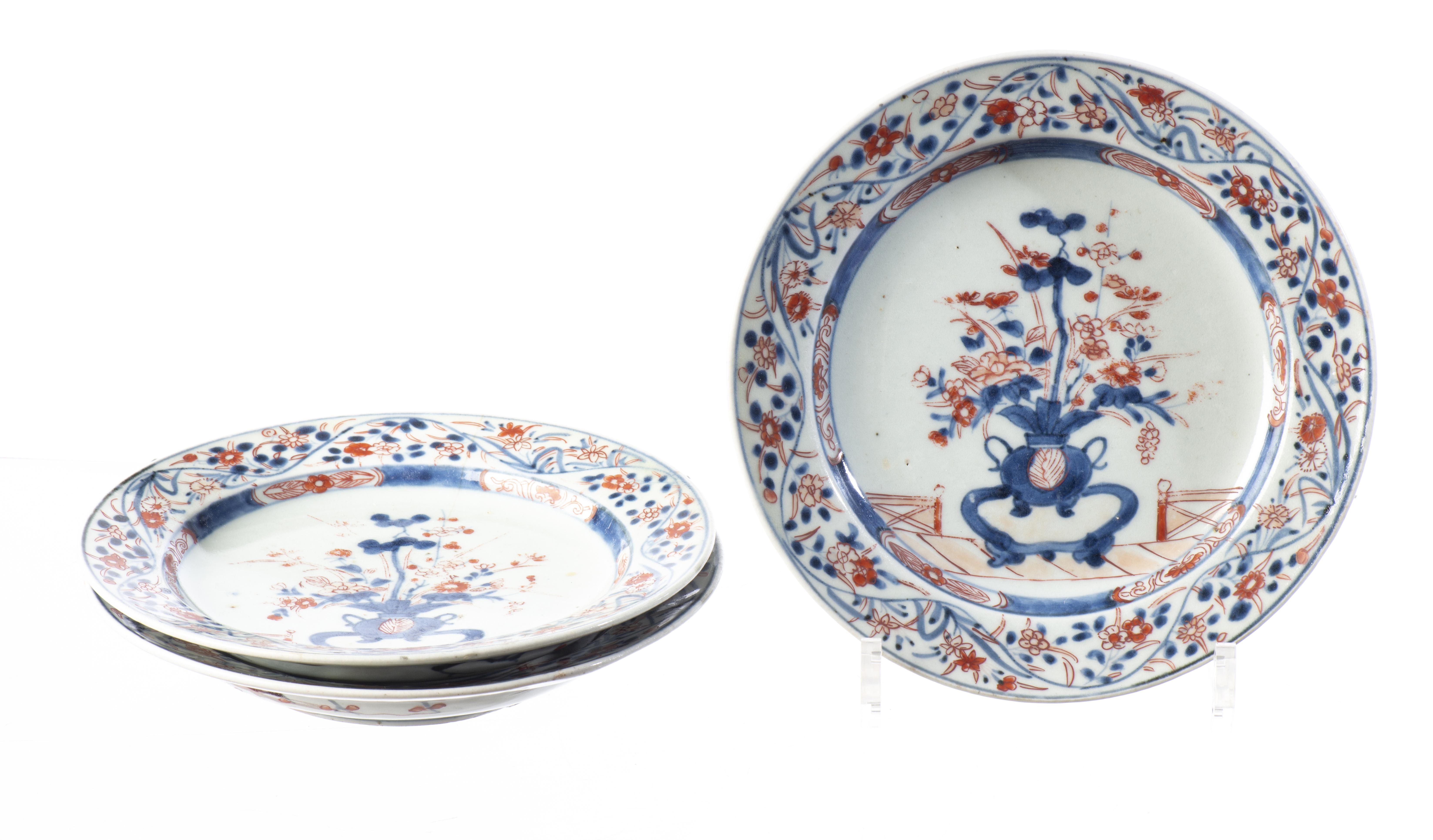 Cinq assiettes plates en porcelaine du Japon à décor Imari et Imari famille verte, trois Imari à motif central au vase fleuri et deux Imari famille verte à motif de pavillon de jardin. Ère Edo XVIIIe.