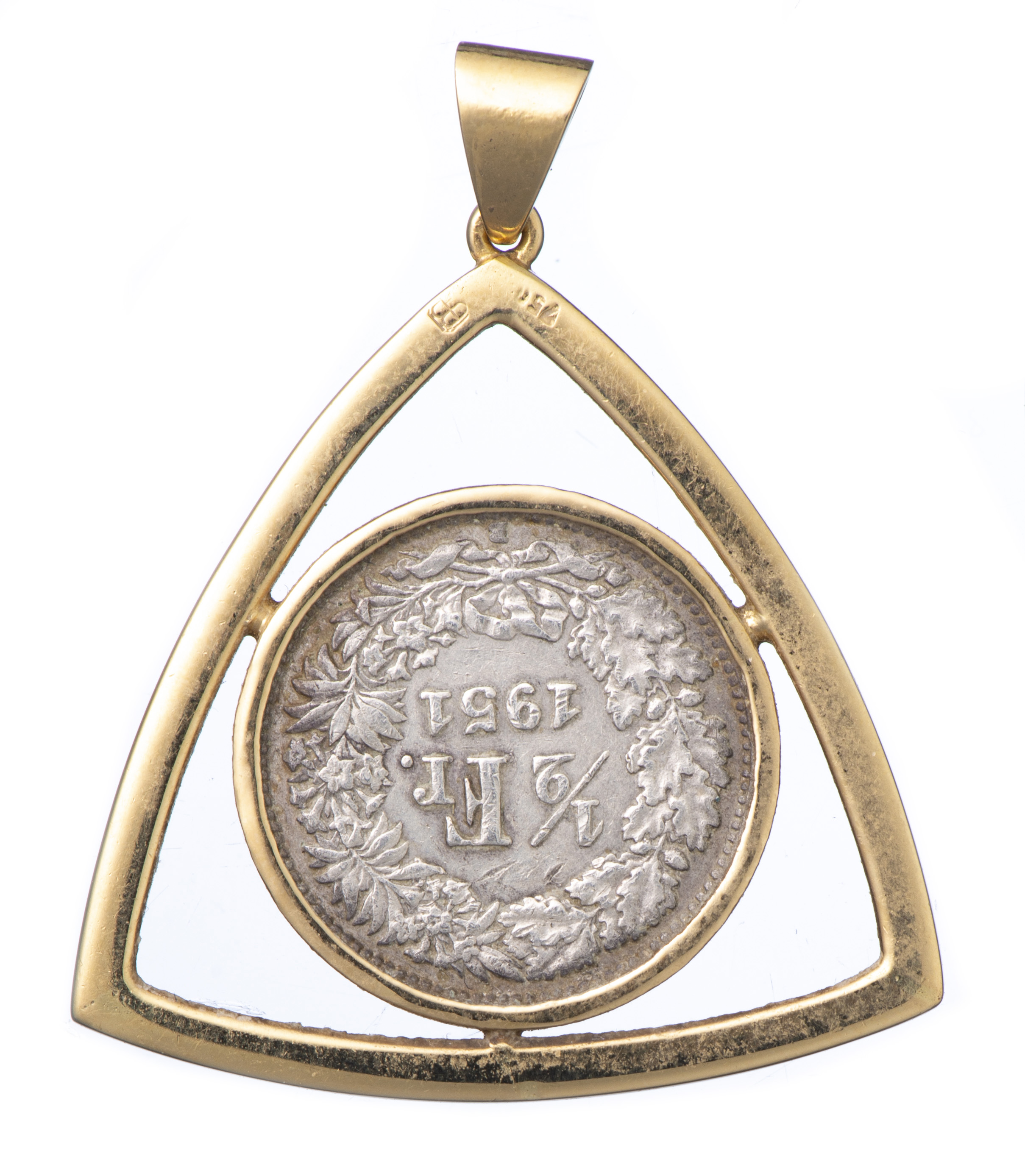 Pendentif en or jaune retenant un 1/2 franc Helvetia 1951 en argent