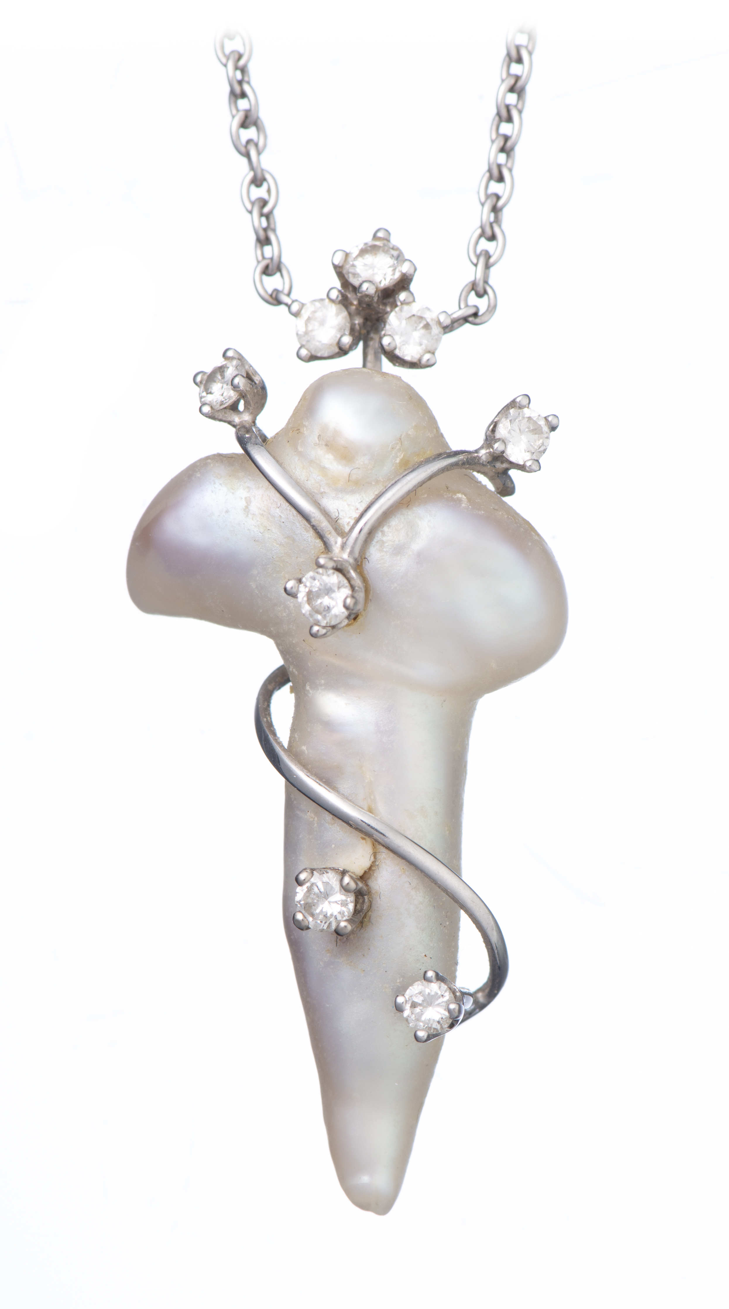 Collier en or blanc composé d'une chaîne à maille forçat retenant une perle de culture baroque rehaussée de diamants