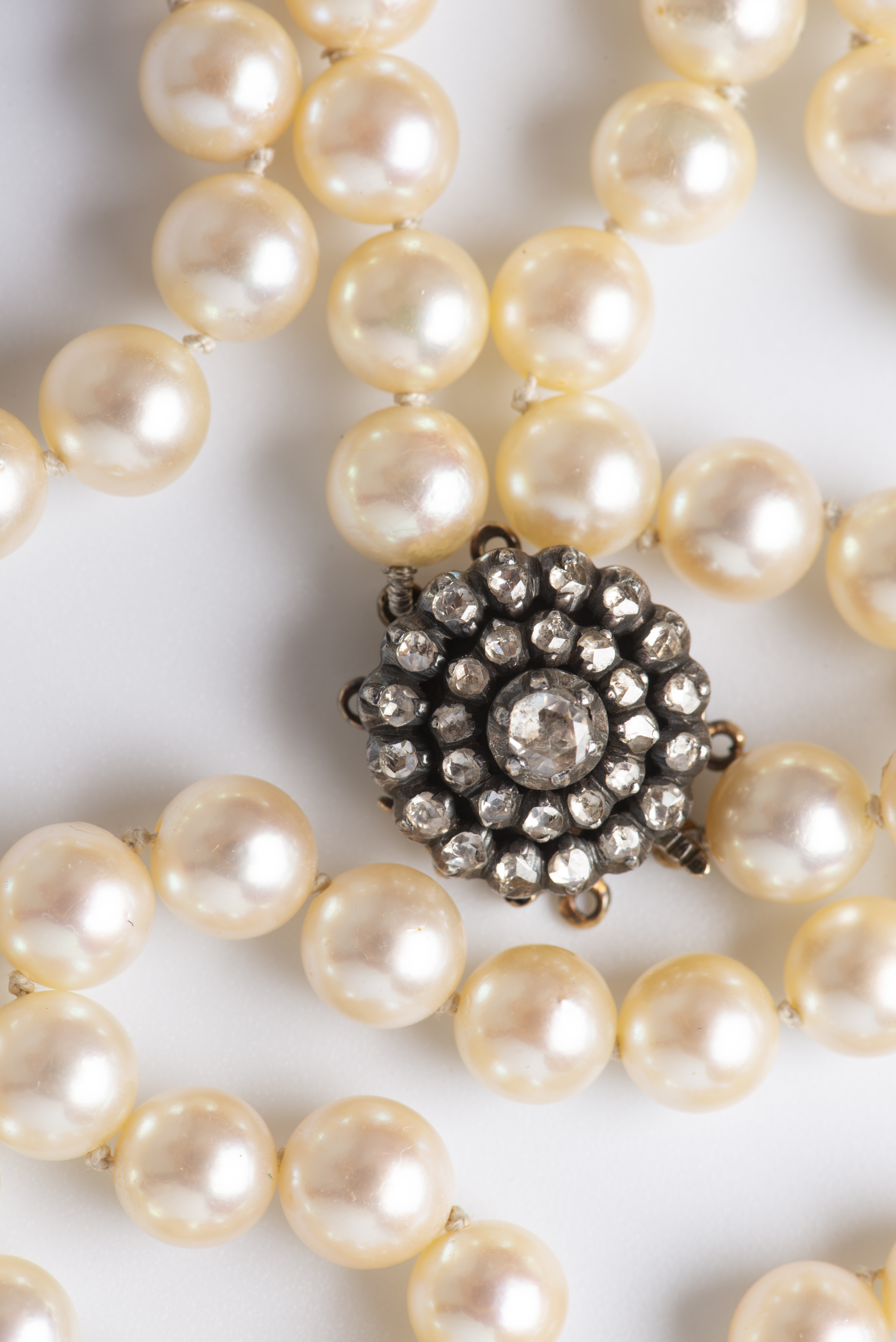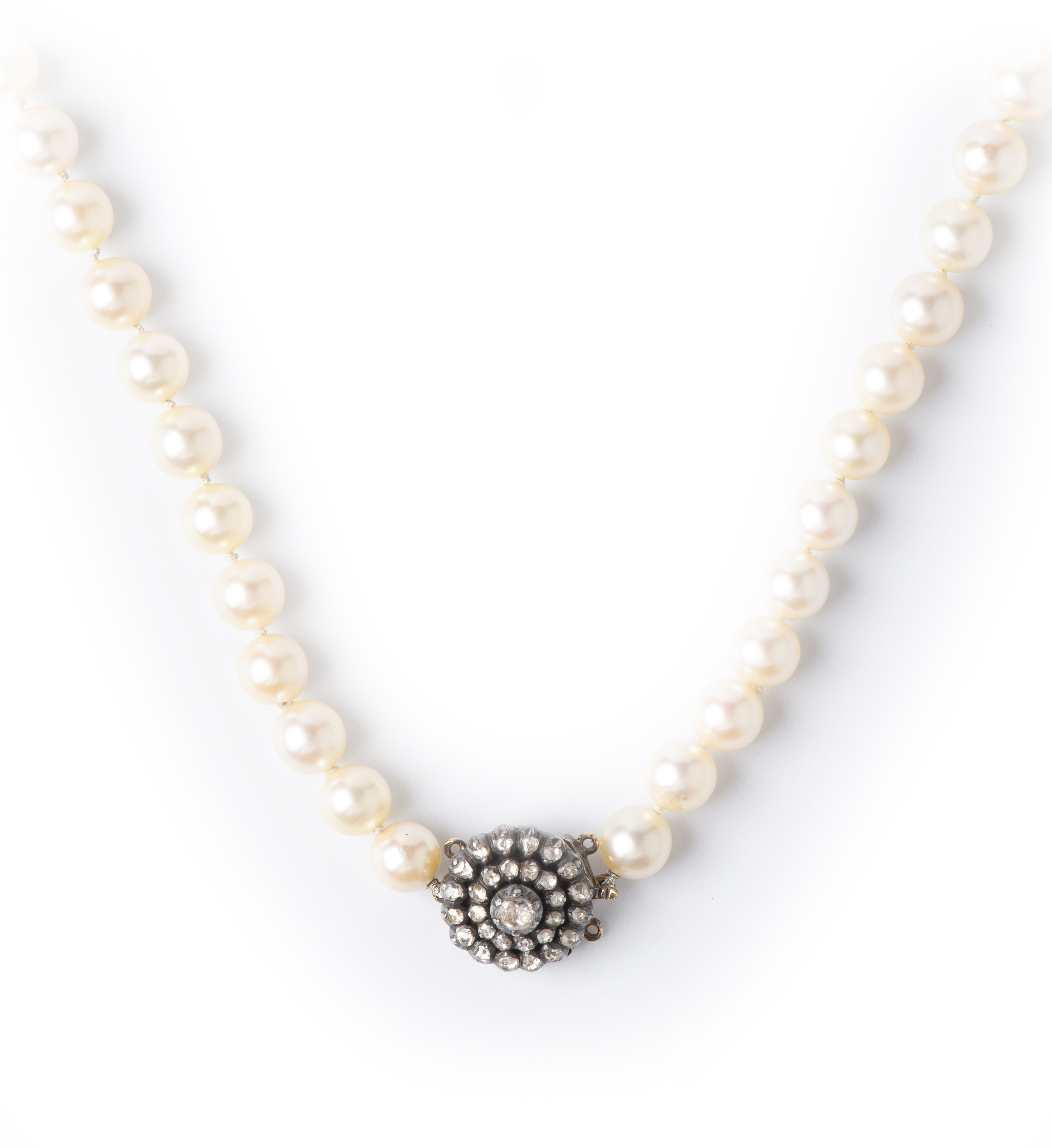 Grand collier sautoir de perles, fermoir en argent serti de petits diamants