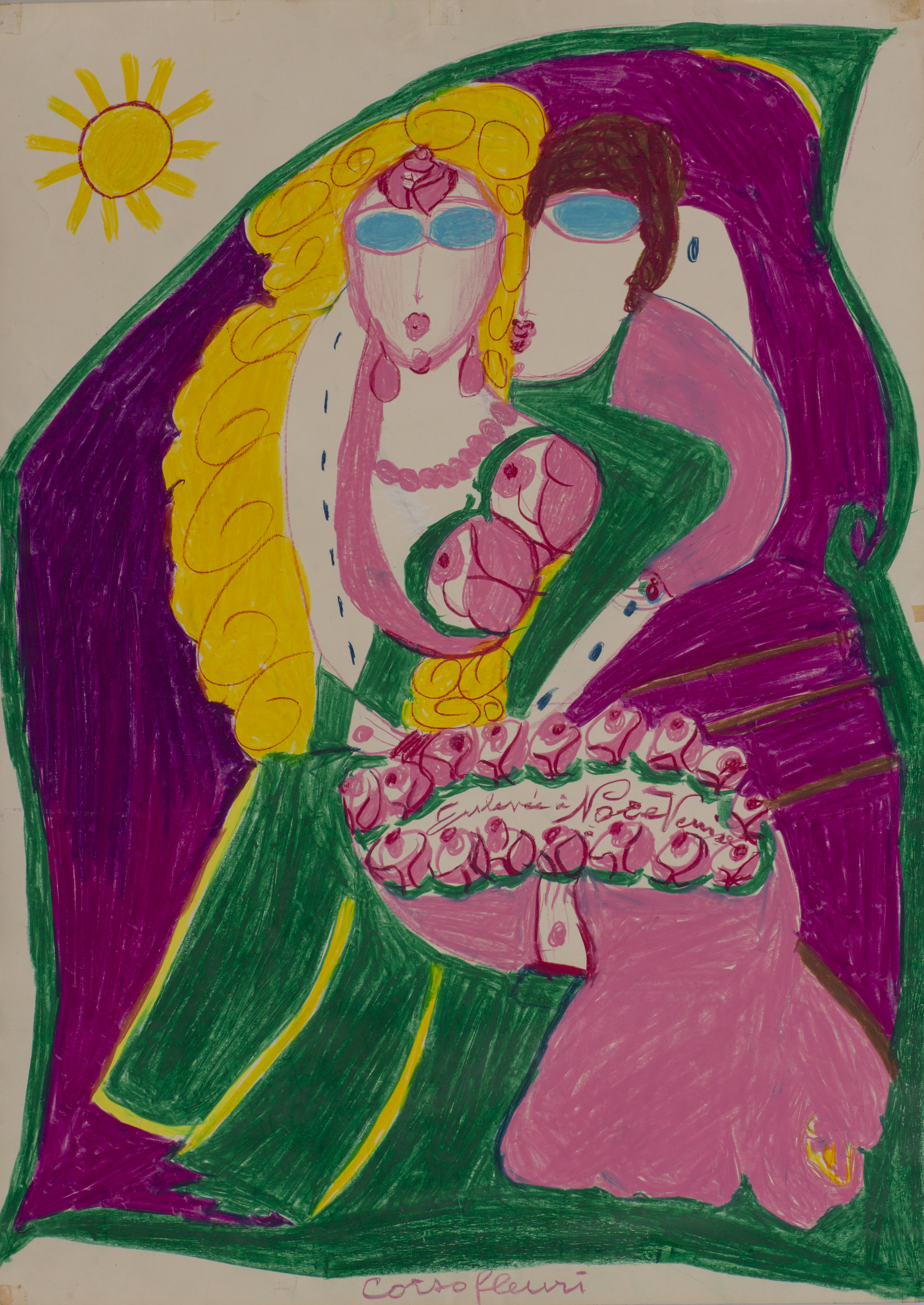 Cette œuvre remarquable de la cinquième période créative d’Aloïse Corbaz témoigne de l’intensité poétique et chromatique qui caractérise ses années. Dans ce pastel, Corbaz déploie toute sa virtuosité pour figurer un couple dans une scène intime et symbolique : un homme vêtu de vert tient sur ses genoux une femme blonde vêtue d’une robe rose à collet d’hermine. La femme, coiffée d’une étoile et ornée de pendants d’oreilles roses, est entourée d’une grande couronne de camélias qui repose délicatement sur ses genoux, tandis que le fond violet cerné de vert amplifie la force expressive de la scène.