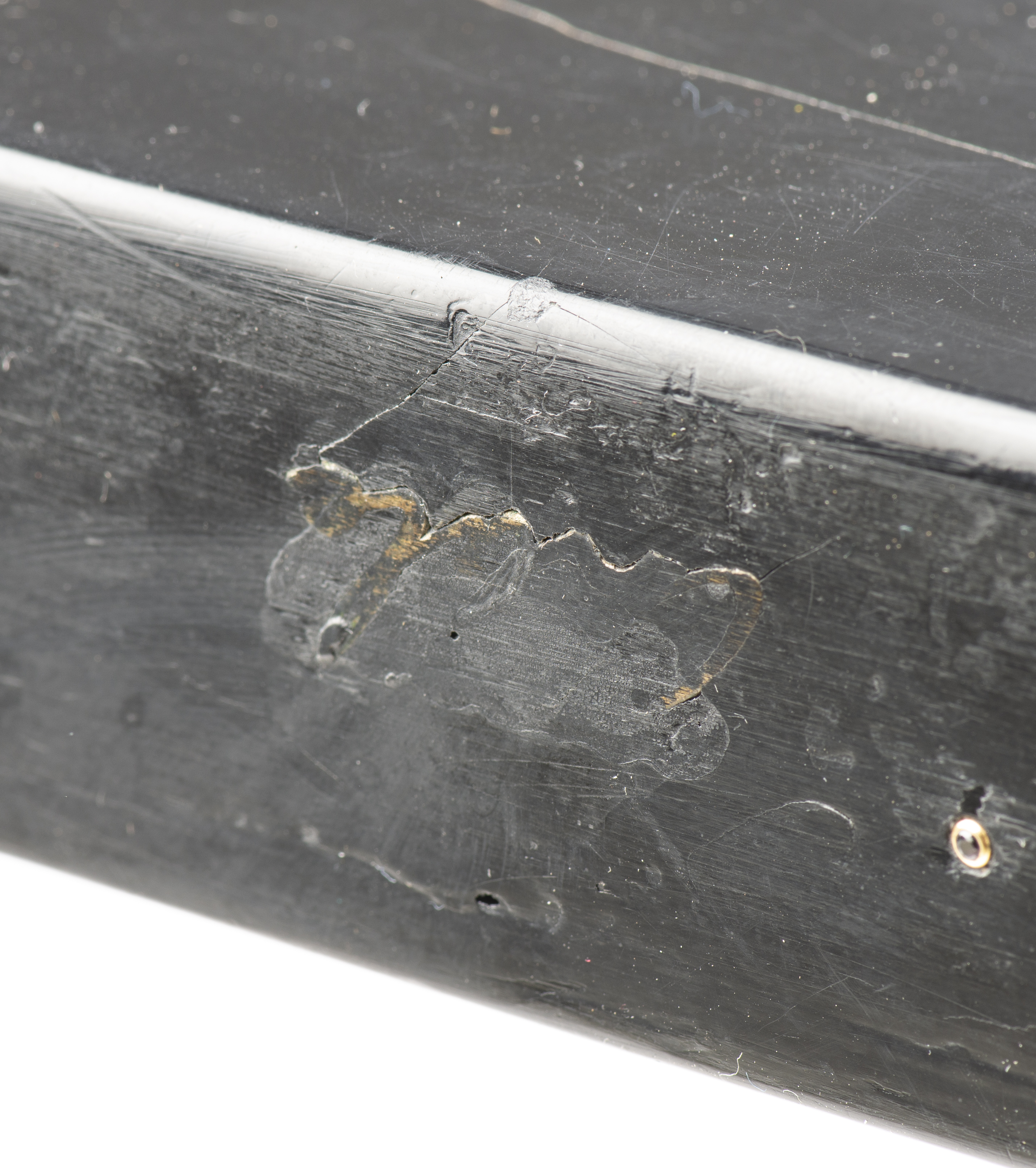 fissures sur le côté partant du bois pétrifié, griffures et chocs. En l'état