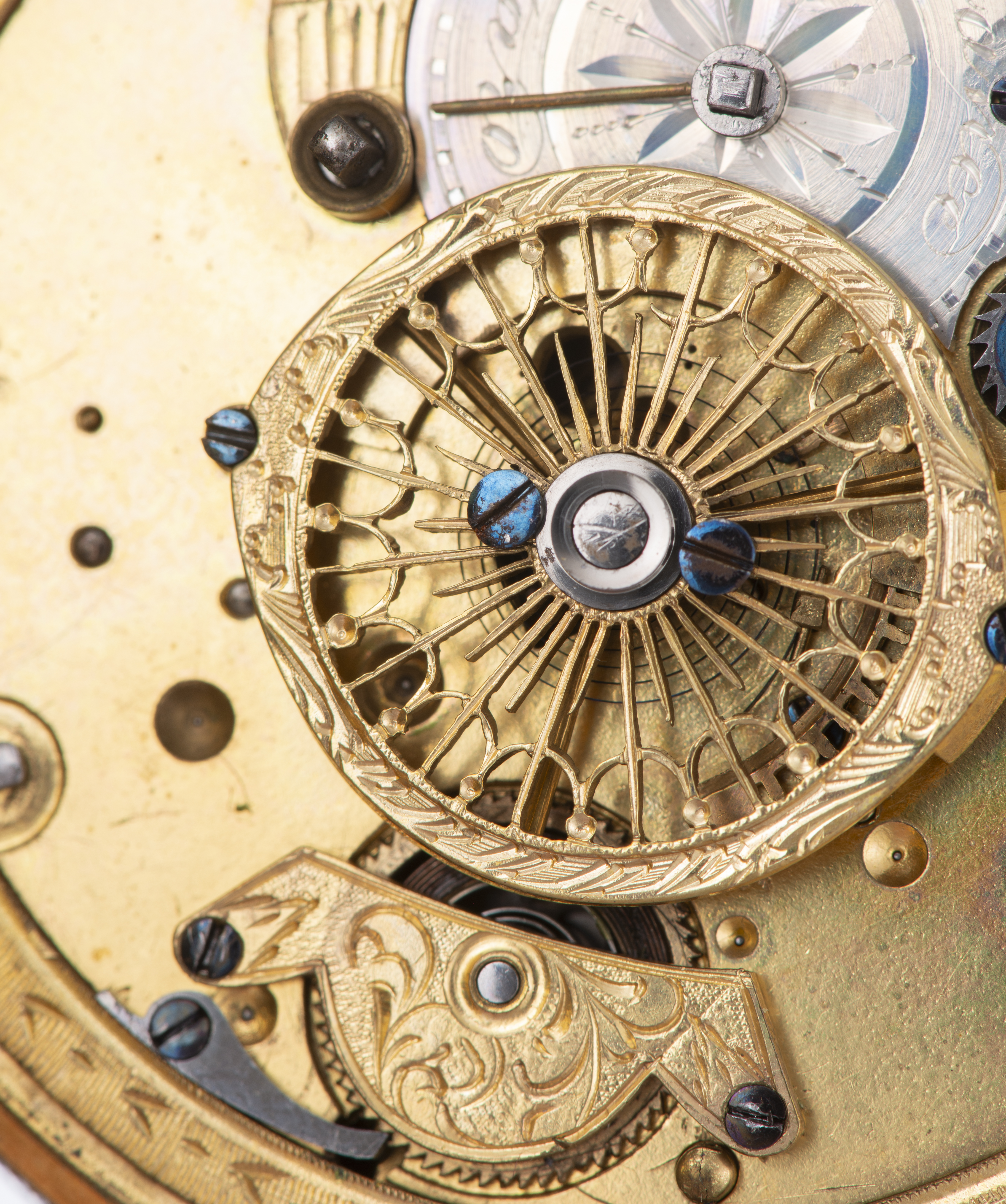 Jean-Antoine Lépine (Challex, 1720 - Paris, 1814) & Fils, montre de poche à boîte en métal doré n° TK 2474 FC/FS. Cadran en cuivre doré et émaillé, chiffres arabes pour les heures dans des pastilles d'émail blanc. Sonnerie des heures.