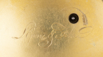 Cadran en cuivre doré et émaillé, chiffres arabes pour les heures dans des pastilles d’émail blanc.
