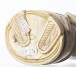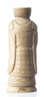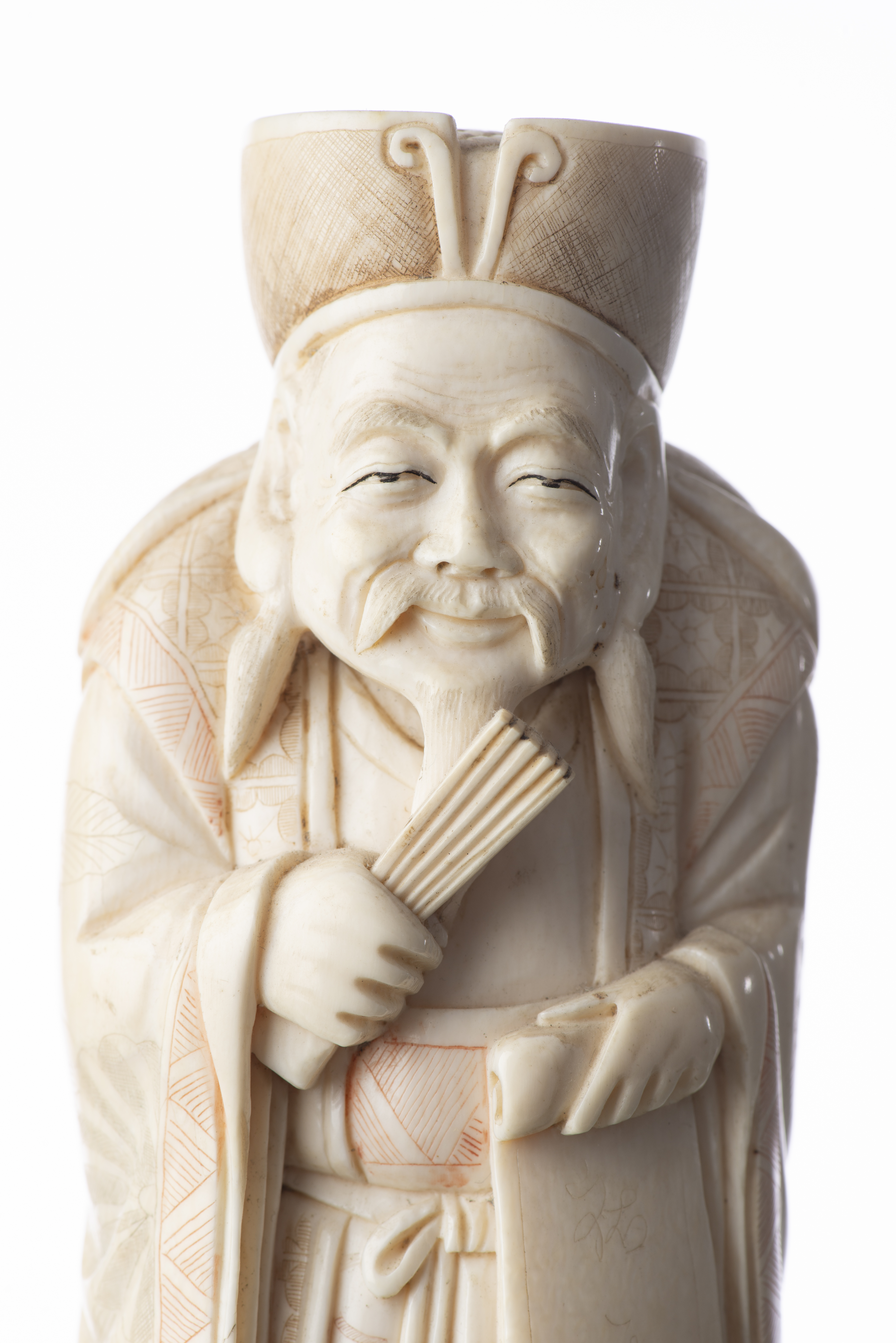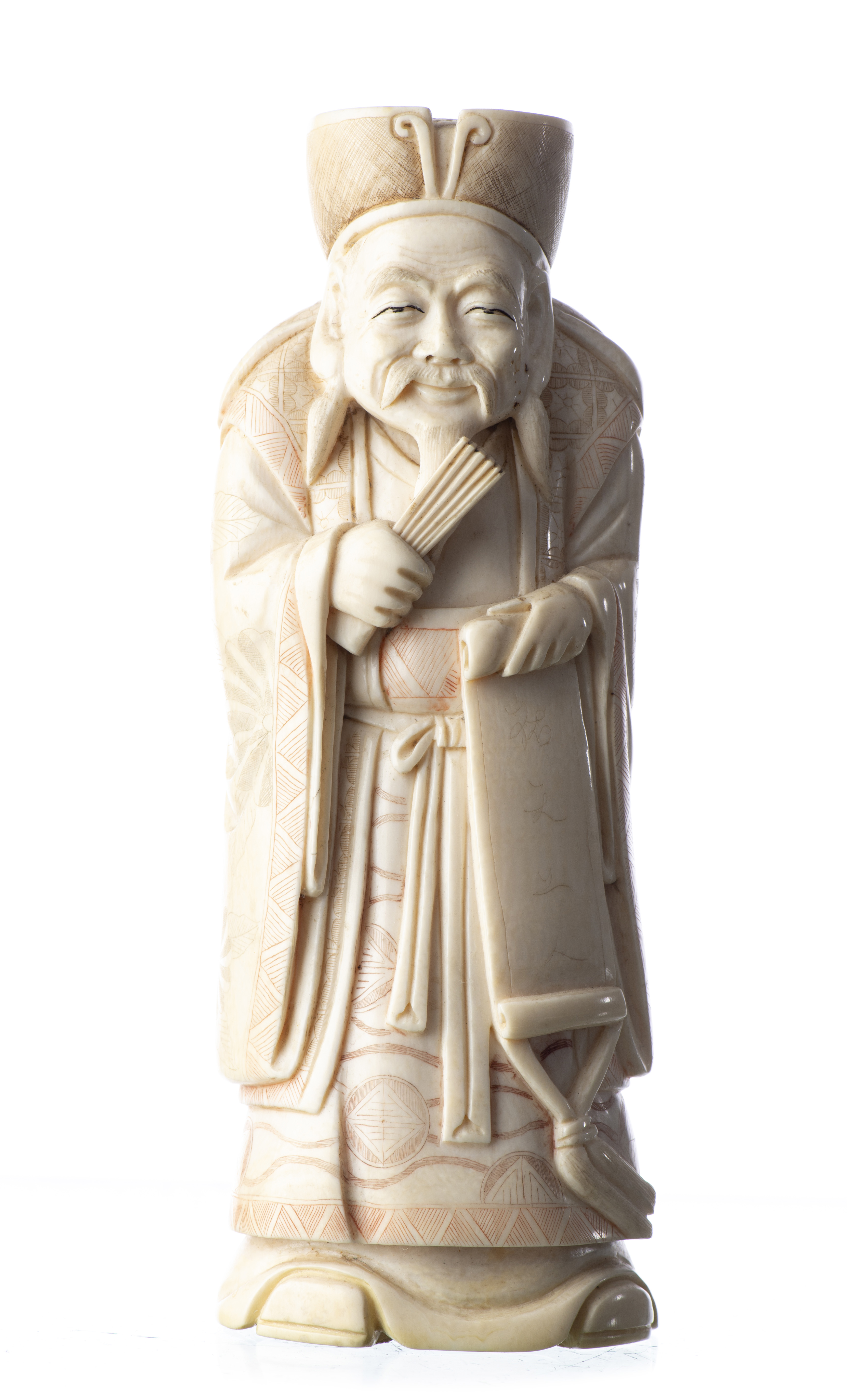 CHINE - Okimono en ivoire représentant un vieux sage tenant un rouleau dans sa main gauche et un éventail dans sa main droite