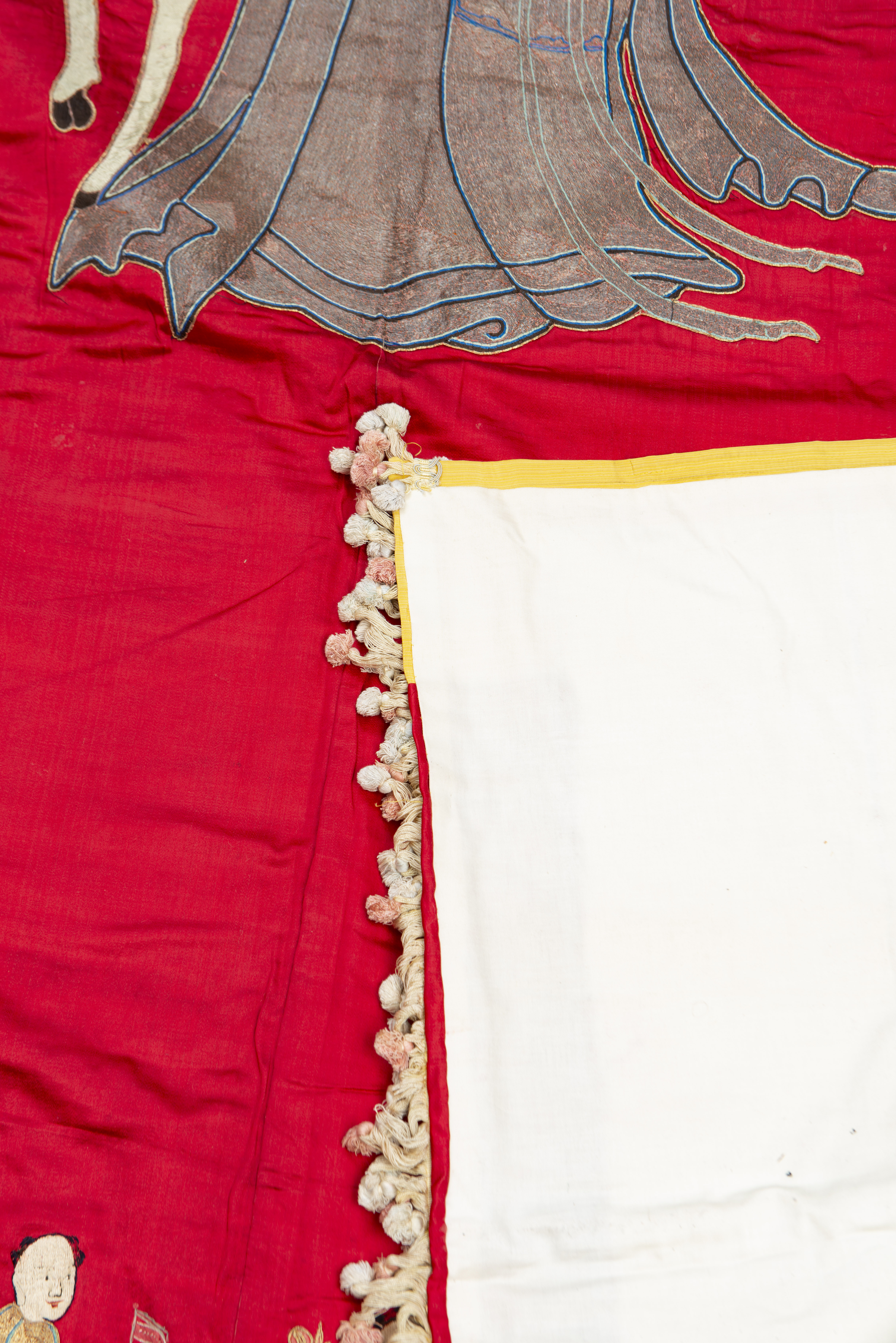 CHINE - Paire de tentures doublées représentant pour l'une un mandarin tenant un ruyi brodé en fils de métal sur champ rouge