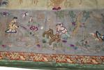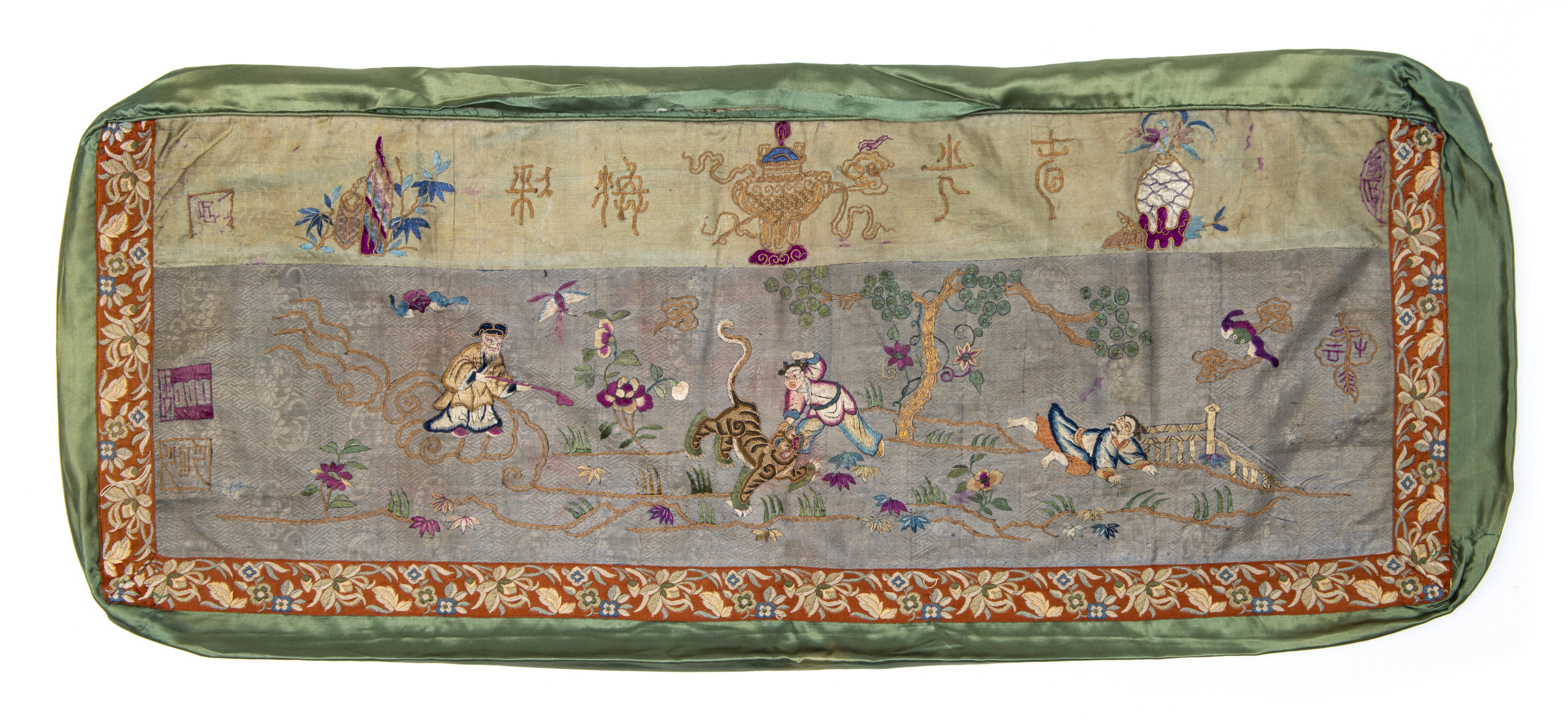CHINE - Tissu en soie de couleur verte brodé d'une scène de chasse au tigre cousu en fourre de coussin. Fin des Qing.