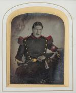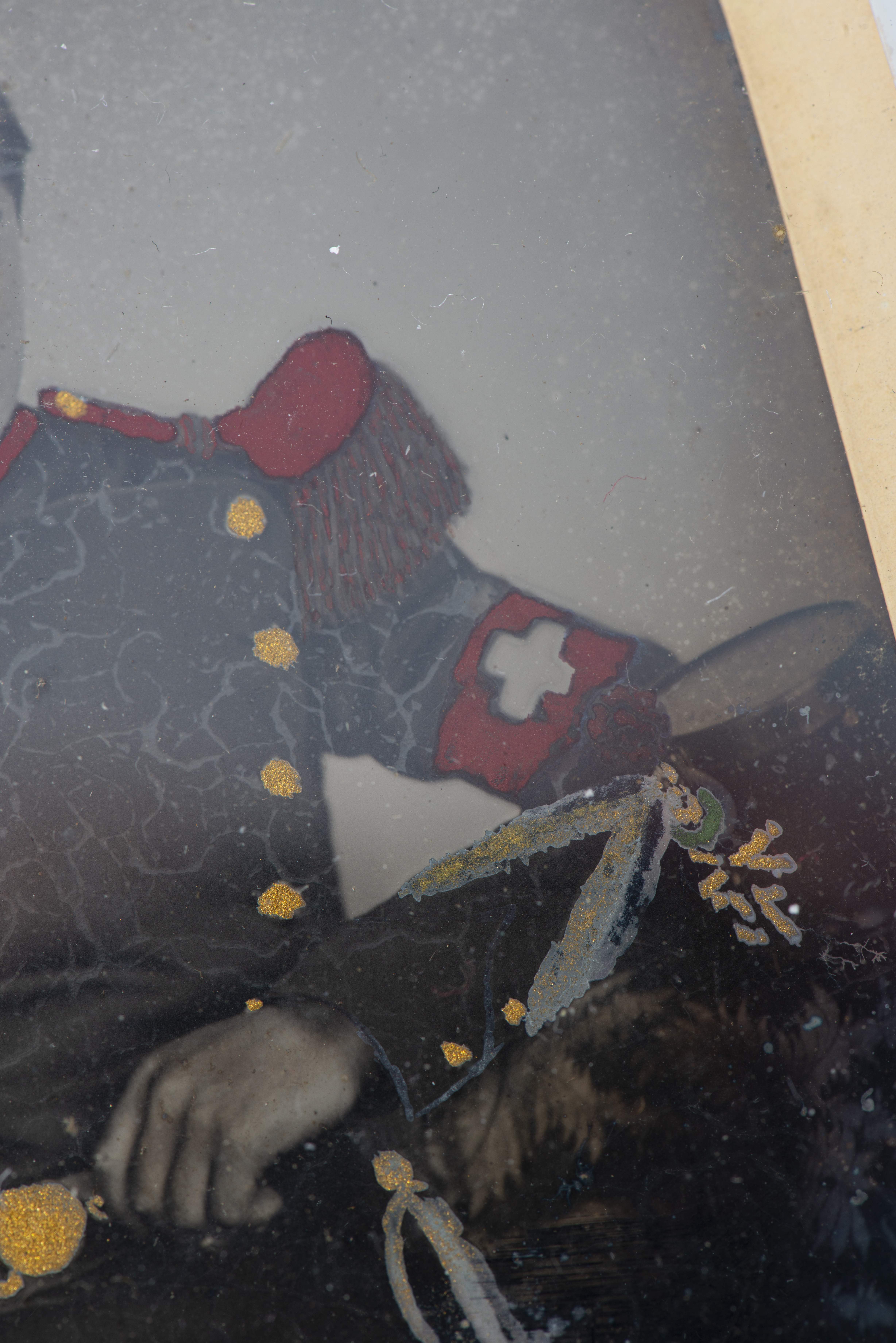 Travail XIXe, Daguerréotype d'un officier Suisse rehaussé à la guache. 10 x 7.5 cm. (à vue)