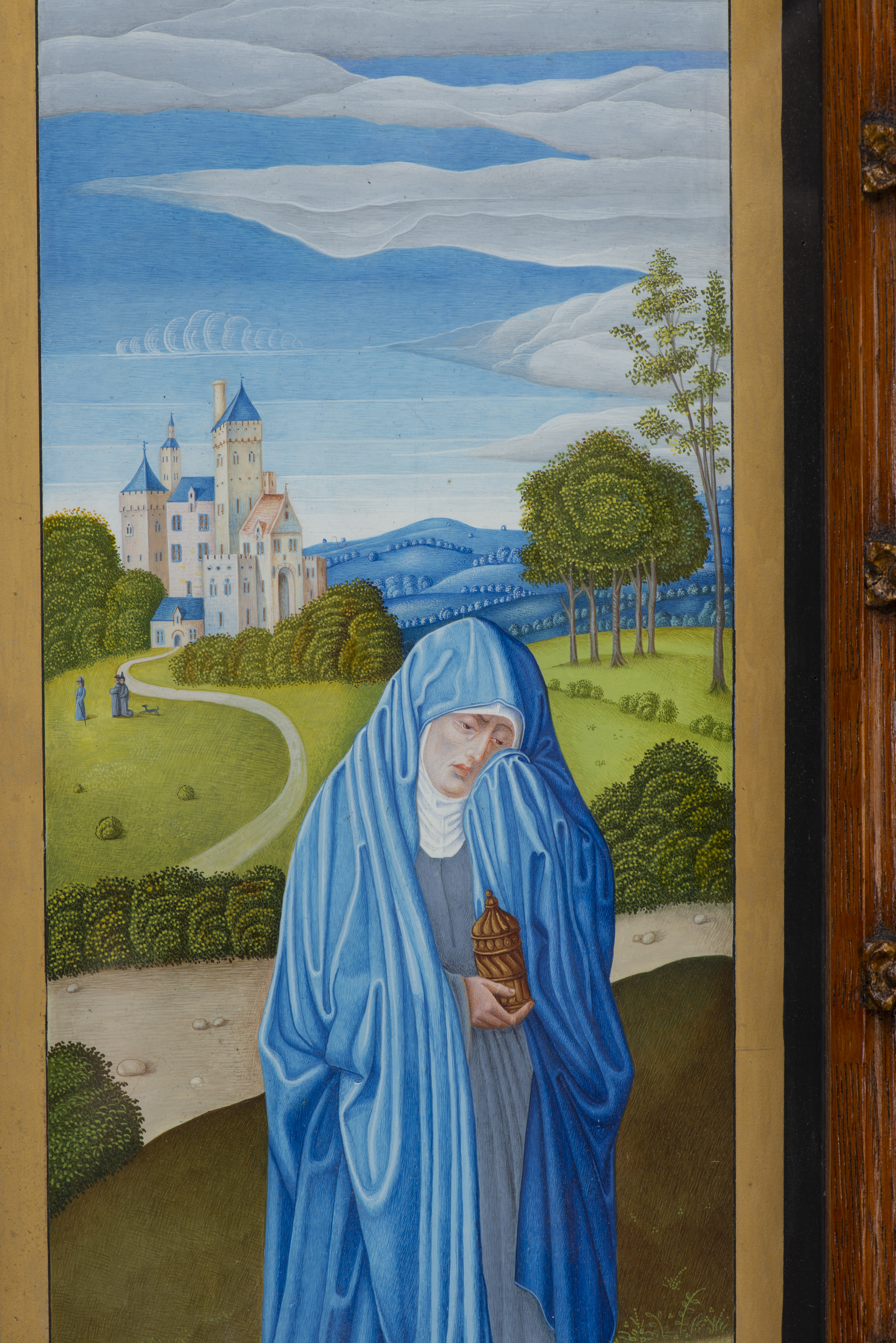 Né à Bruges en 1810 et issu d’une famille d’artistes, Ferdinand Charles François Joseph de Pape se forma aux techniques de la miniature et développa un style néo‑médiéval reconnaissable. Ce triptyque en aquarelle illustre pleinement cette formation : chaque détail, chaque motif, chaque trait révèle la précision et le soin propres aux miniaturistes. La composition conjugue harmonieusement couleurs délicates et finesse du dessin, déployant un univers à la fois poétique et raffiné, fidèle à l’esprit médiéval qui caractérise l’ensemble de sa production.