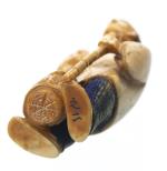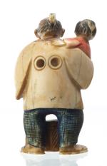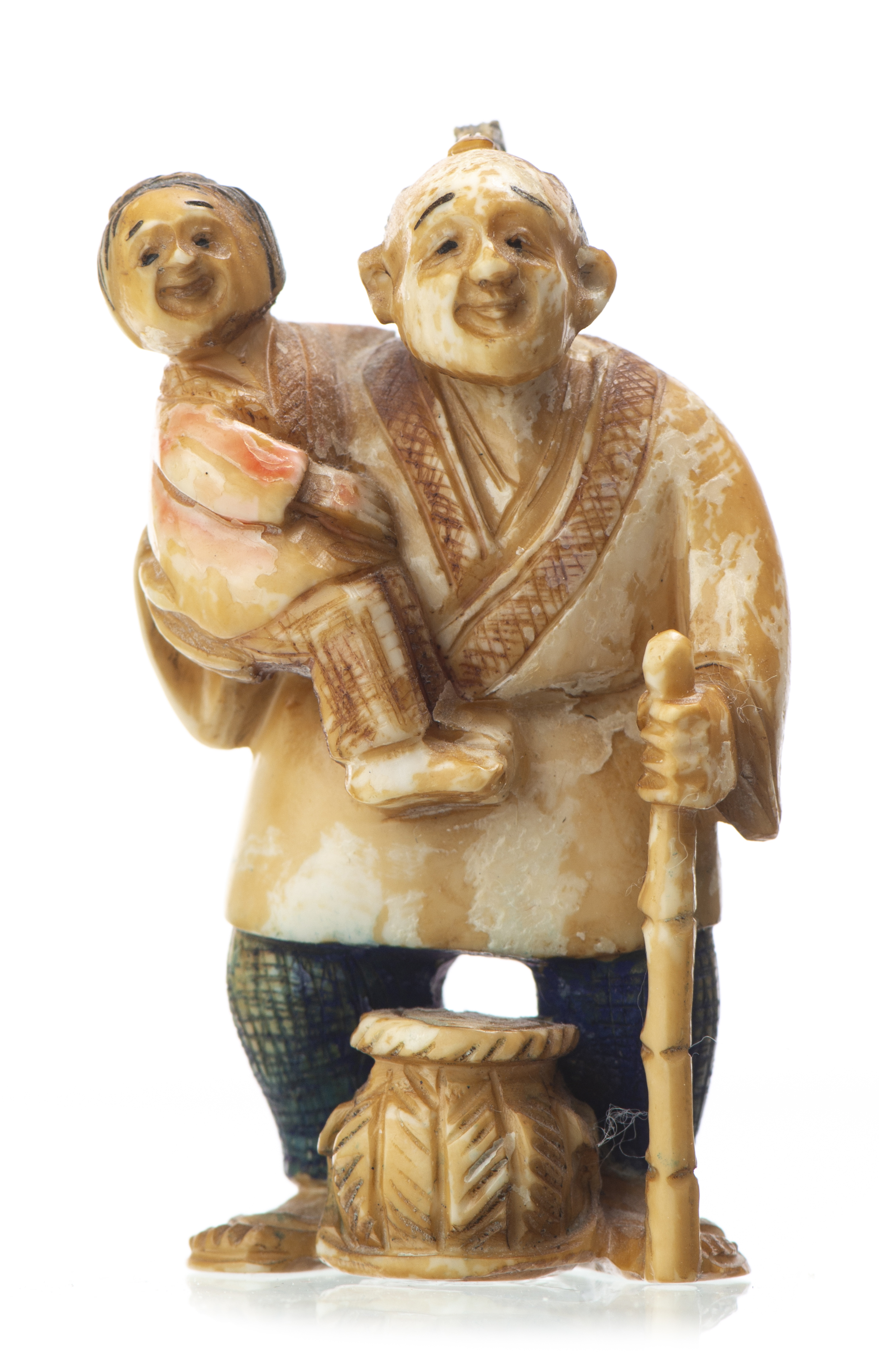 JAPON - Meiji - Netsuke sculpté en ivoire représentant un homme portant un enfant et s'appuyant sur une canne