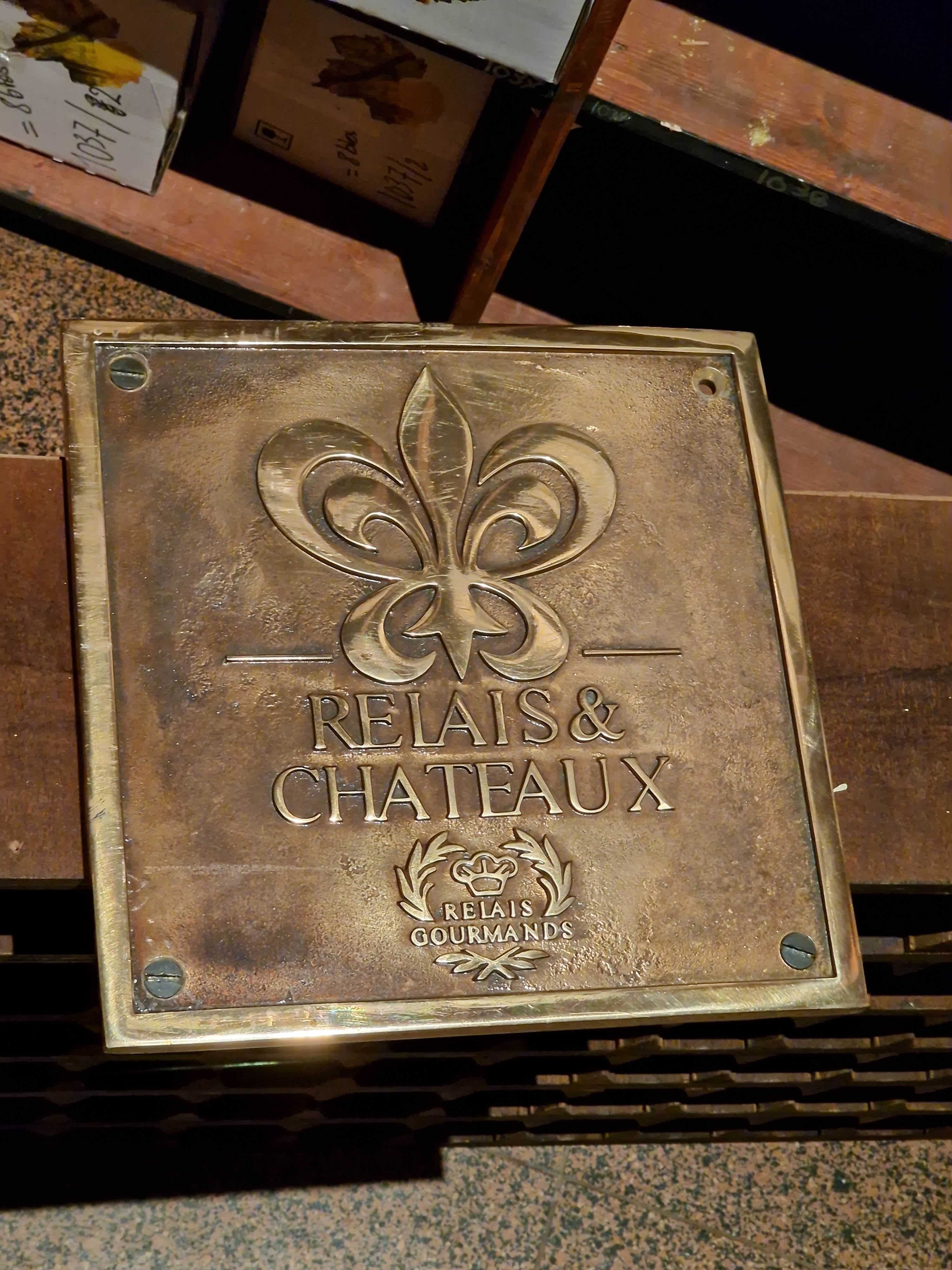 Lot de diverses plaques d'enseignes en laiton doré: "Relais et châteaux", "Traditions et qualité", "Bernard Ravet Grand Chef"