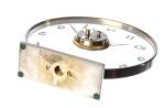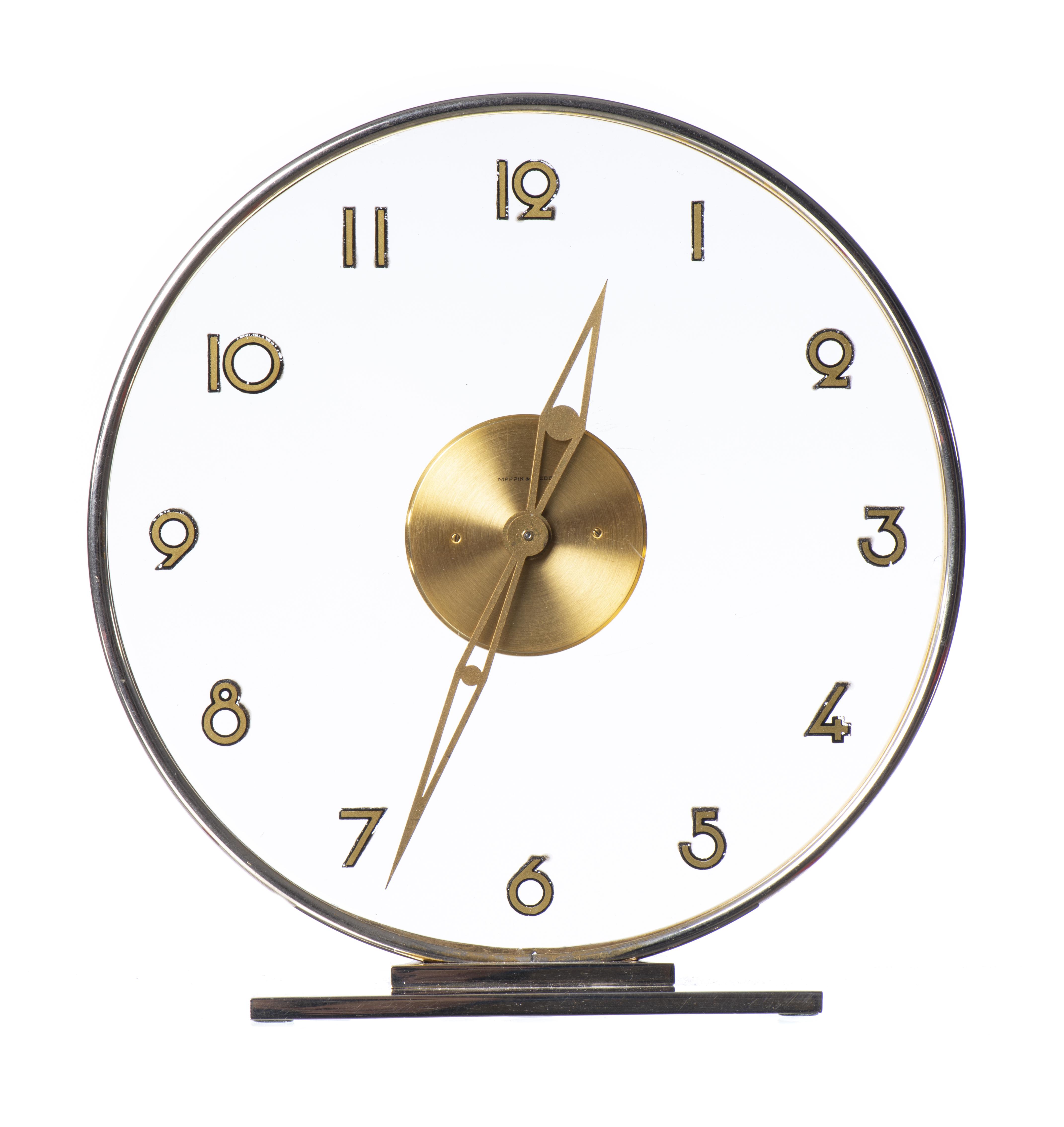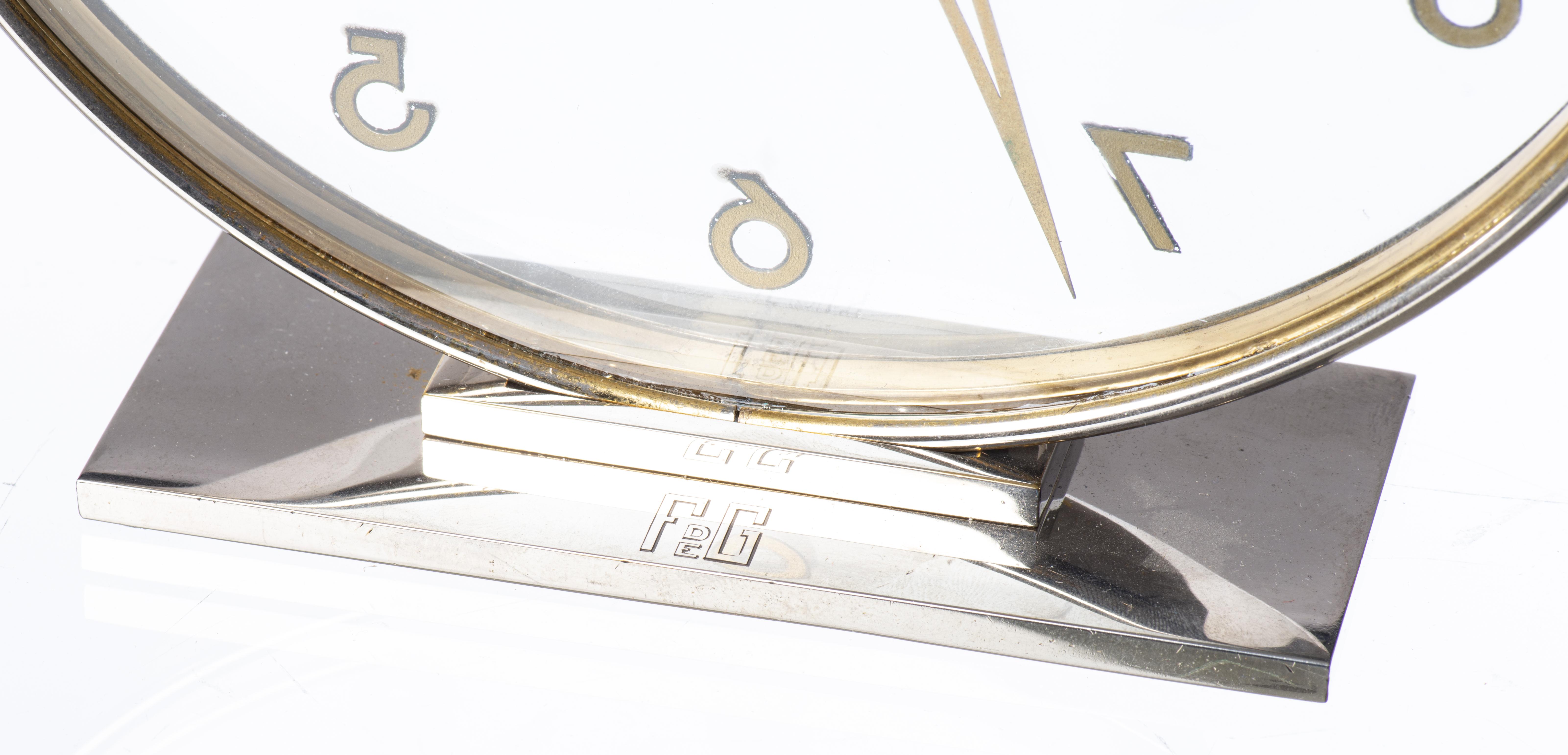 Pendulette de table des années 1940 avec cadran en verre à chiffres arabes peints aiguilles feuilles évidées, pied et monture en métal chromé monogrammé F de G, inscrit sur le mouvement Mappin & Webb.num. 183 sous la base.