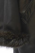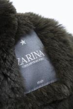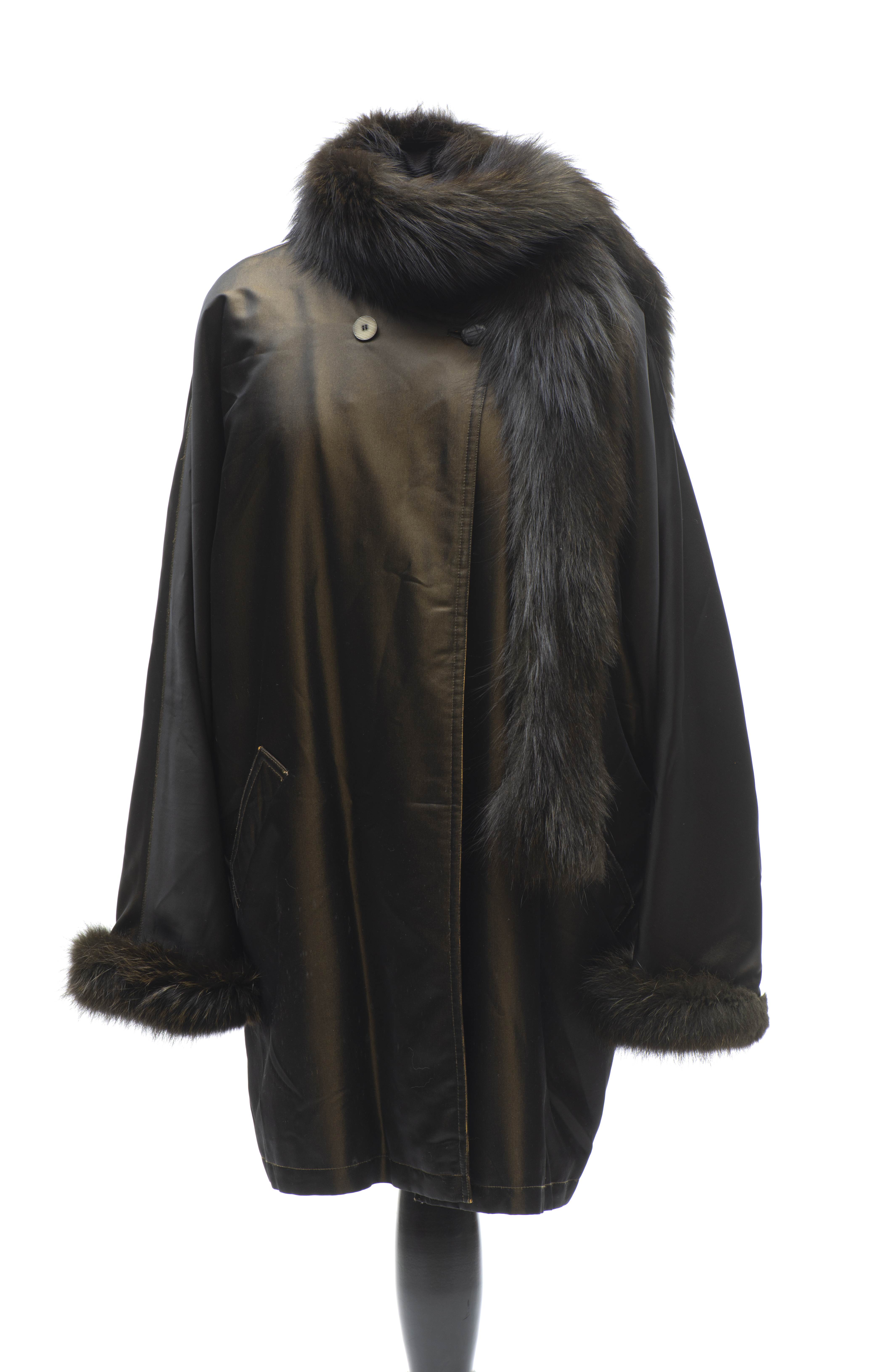 ZARINA, Manteau satiné vert doré avec un col et deux manchons en renard teinté noir, doublure intérieure amovible en loutre de mer. Étiquette ZARINA Contemporary Furs Italy